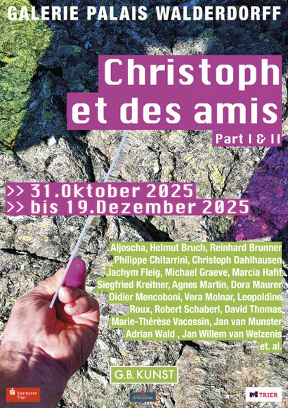 Der international agierende Künstler und Kurator Christoph Dahlhausen zeigt in dieser Doppelausstellung Werke von KollegInnen, mit denen er entweder seit langem befreundet ist, war oder gerne befreundet gewesen wäre. In mehrfacher Hinsicht sind die Werke und künstlerischen Positionen Wegbegleiter. Die gezeigten Werke von über 15 KünstlerInnen aus 8 Ländern sind sowohl Unikate als auch Auflagenwerke (Editionen und Multiples). Der erste Part der Ausstellungen „Christoph et des amis“ fokussiert auf Malerei und Materialität. Der folgende, zweite Part thematisiert Licht und Reflexion auf unterschiedliche Weise.